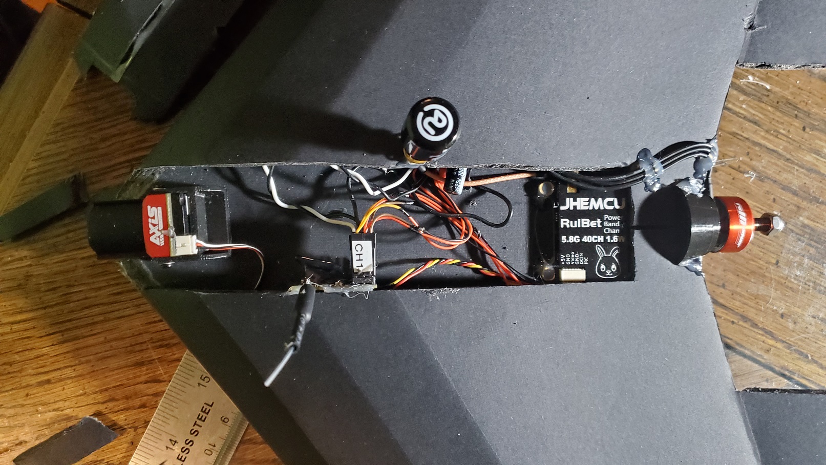 I did the same as with the Lightwing, cut open the fuselage area to make it easier to fit all the electronics. I moved the video transmitter towards the rear, as well as left it uncovered so it could get as much cooling as possible. I added some super-bright SMD LEDs with black 32 gauge wire (not shown in the fuselage picture since it was taken before the lights were added).