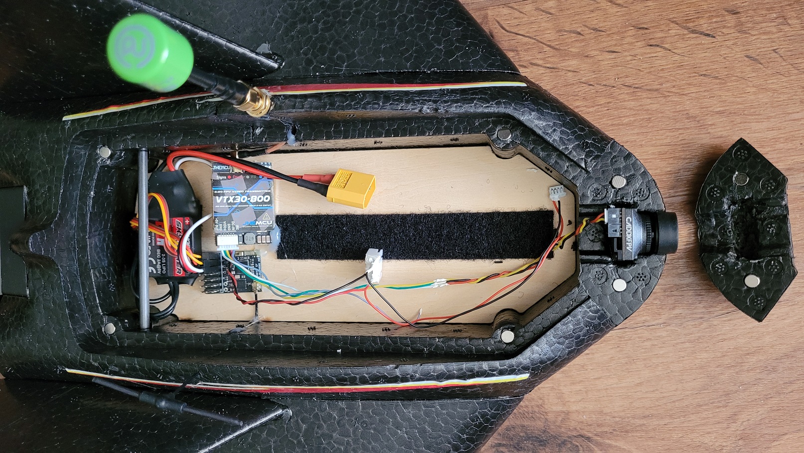 This inexpensive FPV wing from AliExpress performs really well for a PNP kit. I orginally put in the same ultra small and cheap VTX and camera like I used in the MicroBat, but decided after the maiden that since it flew so well it needed a better camera system. Not bothering with a flight controller since again, flies well enough on it's own, and don't intend on going ultra-far when flying it around. I had to cut the foam a bit to accomodate the larger camera, as well as some small cuts in the fuselage for the radio and video receiver antennae. Created a small wiring harness to plug into the battery balance port to be able to power the VTX, the camera, and the Hawkeye Thumb camera, as well as glued the camera mount to the canopy. I've made a few 3-cell 18650 battery packs that I'll be using for longer flight times.
